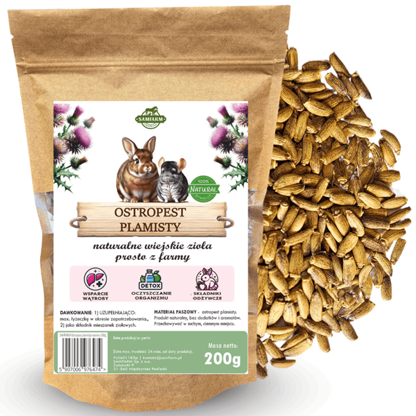 Ostropest plamisty to naturalny i w pełni bezpieczny dodatek żywieniowy, który wspiera zdrowie królików i gryzoni. Nasiona ostropestu są znane z wyjątkowego działania regenerującego i ochronnego na wątrobę, co czyni je doskonałym elementem profilaktyki zdrowotnej w diecie małych zwierząt domowych. Dzięki wysokiej zawartości cennych kwasów tłuszczowych (linolenowego, oleinowego i palmitynowego) stanowią źródło wartościowego uzupełnienia codziennego żywienia.